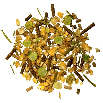 Indeholder lucerne med et højt indhold af fibre, som øger tyggetiden og spytproduktionen.