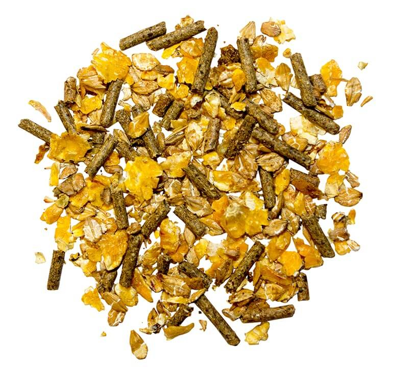 Bygflager (15,00 %), majsflager (15,00 %), hvedeklid (15,00 %), havreklid (12 %), sukkerroemelasse (12,00 %), hvedeflager (10,00 %), majsgluten (6,50 %), hvedemel (5,50 %), roemelasse (4,00 %), calciumcarbonat (2,00 %), natriumclorid (0,80 %), manocalciumfosfat, (0,70 %).