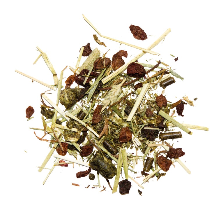 Græs, varmebehandlet (48,00 %), Druekvas (15,00 %), Sojaskrå (14,00 %), Hørfrøskrå (10,5 %), Planteolie (raps) (4,00 %), Thimothegras, kunsttørret (3 %) Calciumcarbonat (1,0 %), Ølgær (Saccharomyces cerevisae) (1,00 %), Magnesiumoxid (0,90 %), Natriumbicarbonat (0,80 %), Monocalciumphosphat (0,5%).