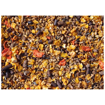Majs, mikroniseret 25,4%, Bygflager 15,2%, Æblerester 12%, Hvedeklid 10,8%, Hørfrø, ekstruderet 8,2%, Soyabønner, varmebehandlet 5,0%, Calciumkarbonat 3,2%, Johannesbrød 3,0%, Solsikkekerner 3,0%, Sukkerroemelasse 2,9%, Linolie 2,5%, Gulerod, tørret 1,0%, Havregryn 1,0%, Natriumklorid 1,0%, Majskolbemel 0,8%, Hvede 0,6%, Ølgær 0,6%, Magnesiumfosfat 0,6%, Dicalciumfosfat 0,5%, Soyaskrå 0,4%, Soyaolie 0,3%, Mælkepulver 0,2%, Tørrede roesnitter 0,2%, Druesukker 0,1%, Hvedestivelse 0,1%, Monocalciumfosfat 0,1%, Magnesiumoxyd 0,1%.