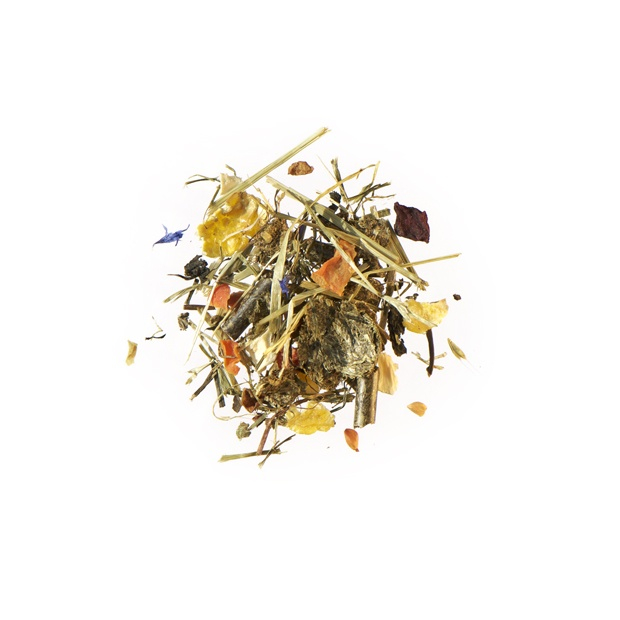 Lufttørrede enggræsser og urter, majsflager, bygflager, æblepresserester, gulerødder i tern, hyben, pastinak i tern, roer i tern, hørfrø, morgenfrueblomster, hindbærblade, brombærblade, kornblomstblomster, vitamin- og mineralfoderblanding