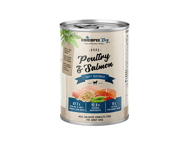 Sammensætning: 0% gluten holdige kornprodukter, 45 % kød og kødprodukter (heraf 35% and, 10% kylling), 22,7% ande boullion, 20% fisk og fiskeprodukter (heraf 20% lakse filet), 5 % rismel, 4 % gulerødder, 2% ærter, 1 % mineraler, 0,2% rapsolie, 0,1% inulin