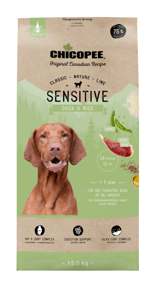 Fuldfoderet er særlig velegnet til fodersensitive hunde. CNL Sensitive And & Ris er uden hvede og den eneste animalske proteinkilde er and (single-protein).