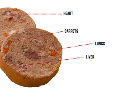 Sammensætning: 80% okse og indmad (45% oksekød, 15% okselunge, 5% okselever), 10% gulerod, 4% malede græskarkerner, 1,3% hyben pulver, hørfrøolie, havsalt, æggeskalspulver, mineraljord