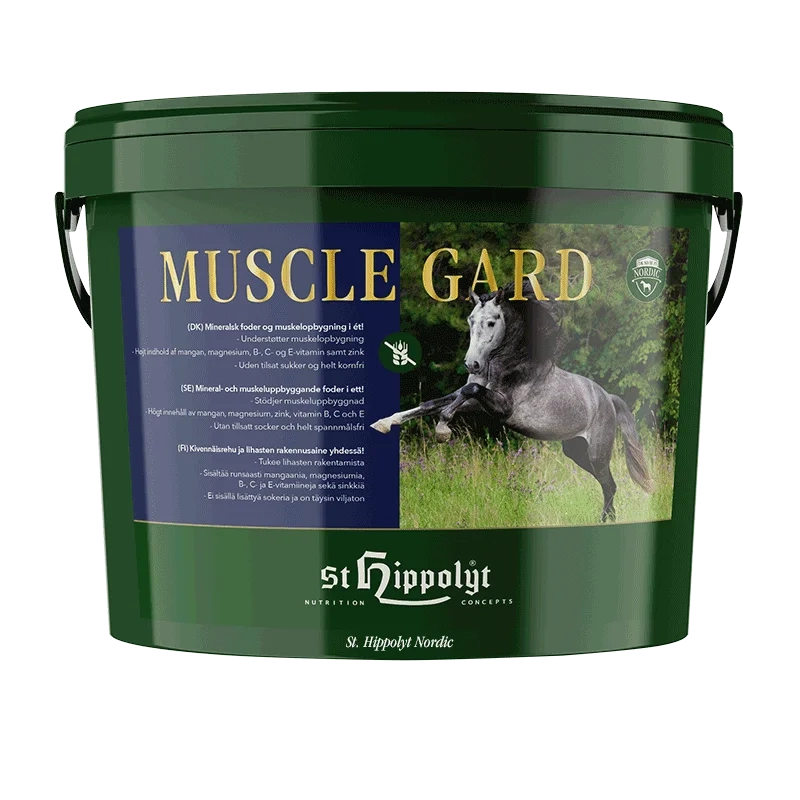 Muscle Gard er et mineral- og muskelopbygningsfoder med et højt indhold af essentielle aminosyrer og et mineral- og vitaminindhold, der er perfekt afstemt efter det daglige behov hos sports- og præstationsheste.