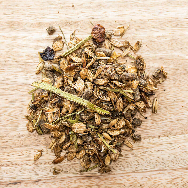 Bygflager (mælkesyrefermenteret), roefibre, majsflager (mælkesyrefermenteret), fuldkornssorthavreflager 9 %, roetop, sojaflager hydrotermisk forbehandlet*, snittet lucerne, blanding af letvalsede oliefrø og oliefrøkager (hørfrø, solsikke) 4,5 %, risklid, koldpressede olier (hørfrø, solsikke, majskim) 3 %, frugtfibre (æbler, druer), hvedeklid, majskim, PalaSyrup (Isomaltulose mol.), ølgær, magnesiumfosfat, snittet varmlufttørret alpehø, salt, havalgekalk, eddike, certificeret plantefoderkul
