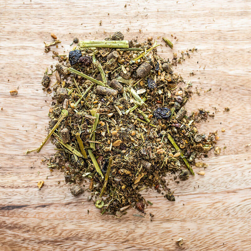 Bygflager (mælkesyrefermenteret), snittet varmlufttørret alpehø, snittet lucerne, frugtfibre (æbler, druer), roetop, hvedeklid, majskim, majsflager (mælkesyrefermenteret), PalaSyrup (Isomaltulose mol.), roefibre, havreskalklid, blanding af letvalsede oliefrø og oliefrøkager (hørfrø, solsikke, fennikel, sortkommen) 3 % , fuldkornshavreflager (mælkesyrefermenteret) 2,3 %, koldpressede olier (hørfrø, solsikke, majskim) 1,2 %, urter (pebermynte, timian, koriander, rosmarin, brændenælde, kamille, bukkehornsfrø) 1,8 %, kalciumcarbonat (marint og mineralsk), bygkim, salt, ølgær, riskim, hvidløg, magnesiumoxid/-fosfat/-sulfat, eddike, certificeret plantefoderkul, gulerødder, ærteflagemel