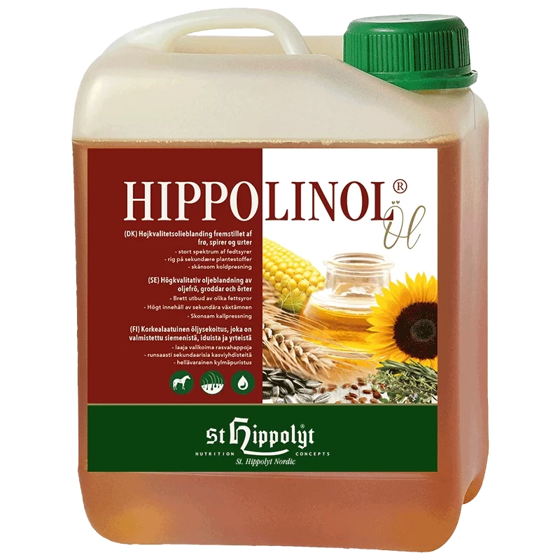 HippoLinol® er en afstemt blanding af koldpresset olie fra hørfrø, solsikkekerner, majskim og hvedekim. Det er en fremragende olie til heste pga. dens mangfoldige indhold af fedtsyrer. Naturlige olier fra urter gør den særlig velsmagende.
