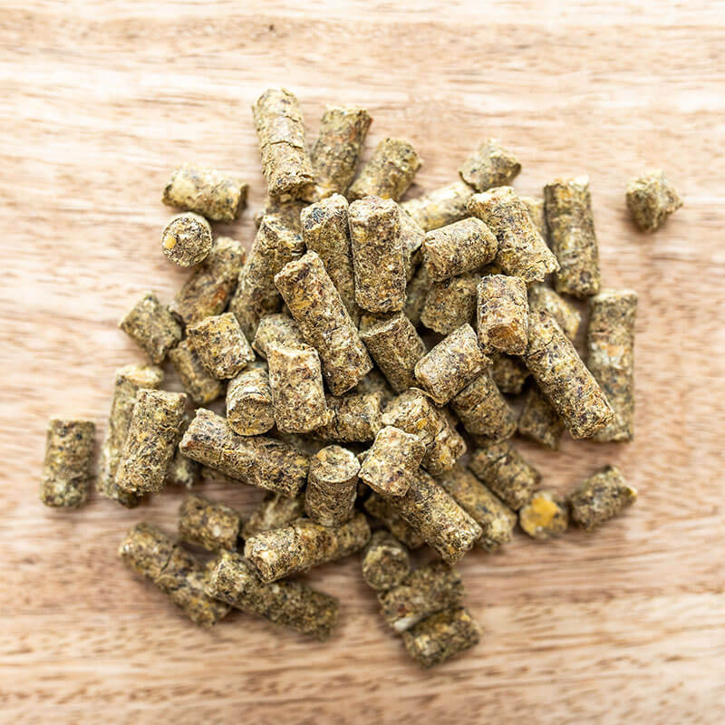 Majsflager (mælkesyrefermenteret), hvedeklid, majskim, snittet lucerne, roefibre, malt, urter (marietidselfrø, pebermynte, artiskokker) 6,5 %, blanding af letvalsede oliefrø og oliefrøkager (hørfrø, solsikke, fennikel) 3,9 %, PalaSyrup (Isomaltulose mol.), ølgær, frugtfibre (æbler, druer), bygflager (mælkesyrefermenteret), kalciumcarbonat (marint og mineralsk), gulerødder, sødt vallepulver, salt, riskim, hvidløg, ingefær, dikalciumfosfat, eddike, magnesiumfosfat/-oxid/-fumarat/-sulfat, koldpressede olier (hørfrø, solsikke, majskim) 0,1 %, havalgemel, malt-gær-urt, ærteflagemel