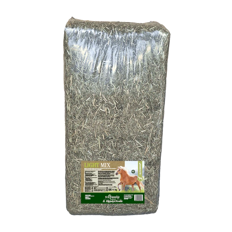 GlyxWiese® Light Mix kombinerer de bedste egenskaber fra lucerne, græsser, foderhalm og olier. Lucerne fungerer som en proteinrig erstatning for kraftfoder, det snittede græs er af høj kvalitet og foderhalmen nedbringer energiniveauet. Suppleret med solsikke- og hørfrøolie giver det en letfordøjelig og næringsrig fiberblanding, der kan have en positiv effekt på hestens tarmflora. GlyxWiese® Light Mix er særlig velegnet til nøjsomme og overvægtige heste og ponyer.