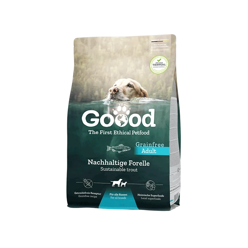 Ørreden kommer fra dambrug, hvor der lægges vægt på trivsel. De bliver opdrættet med naturligt foder, så de leverer proteiner af høj kvalitet. Vi henter vores grøntsager fra lokale landmænd. Den kornfri opskrift med fisk, solsikkeolie og hørfrø indeholder masser af omega-3- og omega-6 fedtsyrer – godt og nærende til hud og pels hos voksne hunde.