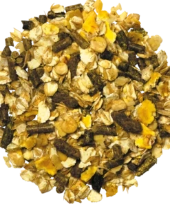 Bygflager, lucerne, hvedeklid, soja, Linamix®, majsflager, rapsskrå, hestebønneskaller, cornflakes, spelt, roefibre, puffede kerner, havreskaller, johannesbrød, rapsolie, isomaltulose (lavglykæmisk kulhydrat), sukkerrørmelasse, OS Complex, Digestive Support.