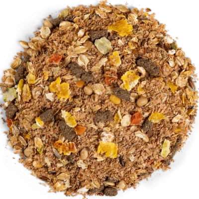 Hvedeklid, bygflager, hørfrø, sojaprotein, poppet korn, havre, majsflager, roefibre, Linamix®, cikoriefibre, kartoffelprotein, ærteflager, rapsolie, isomaltulose (Equisweet®), gulerodsflager, vallepulver, sukkerrørmelasse, natrium bikarbonat, gær, urtemix, naturlige antioxidanter, elektrolytter.