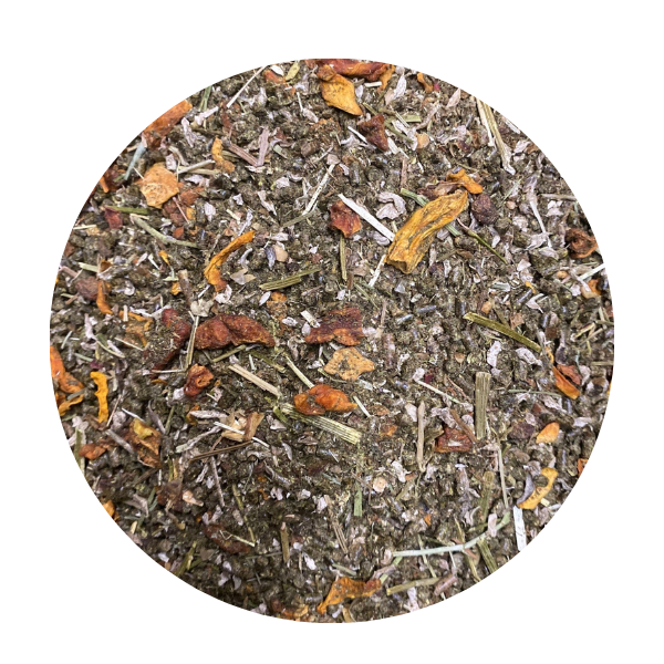 Finsnittet lucerne, Roefibre, Tørret græskar, Ærteflager, Æblepulp, Hørfrø (varmebehandlet), Esparsette, Finsnittet solsikkefrø, Fintformalet rapsfrø (varmebehandlet), Rapsolie, Bukkehornsfrø, Oregano, Salvie, Hvidløg, Persille, Merian, Pebermynte.