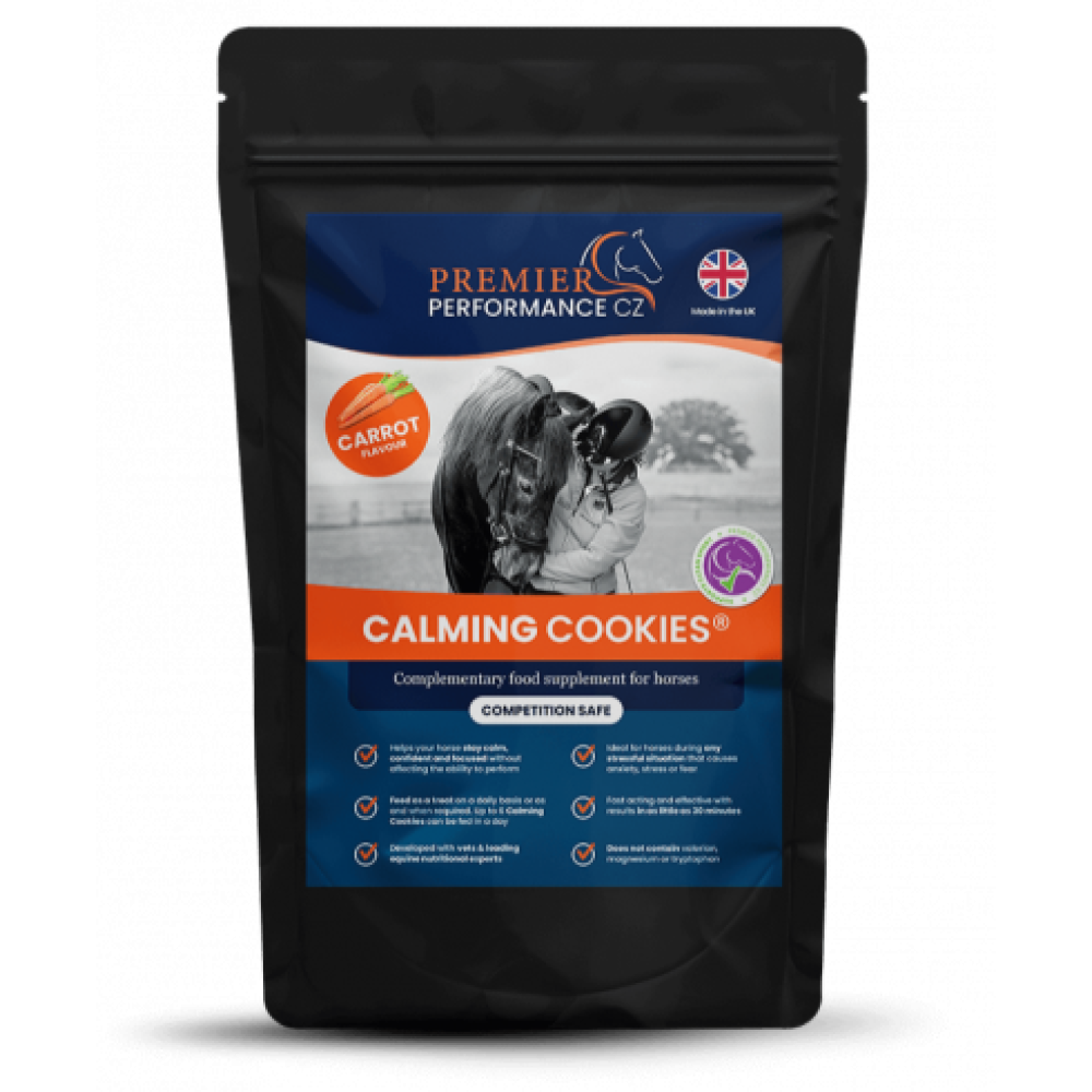 Calming Cookies fra Premier Performance er udviklet med dyrlæger og ernæringseksperter i England, der gennem videnskab har sammensat produkter med naturlige ingredienser i en unik sammensætning for optimal virkning. De naturlige ingredienser er mixet sammen og produceres i hånden til cookies, som er meget nemme at give til sin hest.