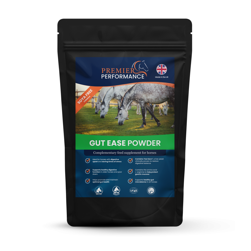 Gut Ease Powder fra Premier Performance indeholder en kombination af Yea Sacc og maveberoligende ingredienser som æblepektin, lecithin og Aloe Vera, der tilsammen understøtter ernæringsmæssigt heste med fordøjelsesproblemer, løse hestepærer og nervøsitet forårsaget af fordøjelsesproblemer.