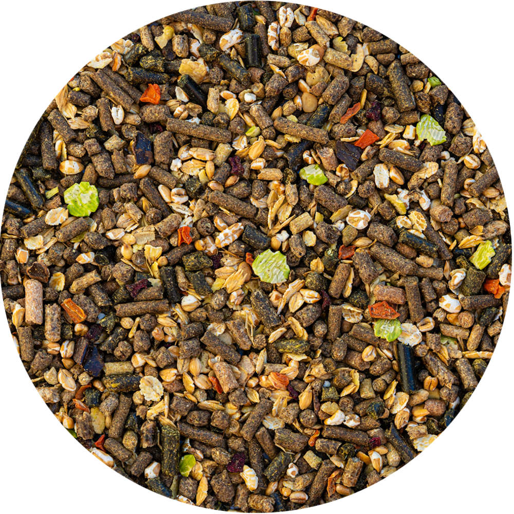 | Ingredienser | Havreskaller, Timoté hø, hørfrøskaller, hørfrø (ekstruderet), Rapskager, lucerne, puffet byg, hvedeklid, byg, roesnitter, ærter, majsmask, sojabønner (NON GMO), rapsolie, brændenælle, Dumosweet, avner fra hestebønner, kartoffelstivelse, johannesbrød, Cikorie, rødbedeflager, gulerodsstykker, ærteflager |