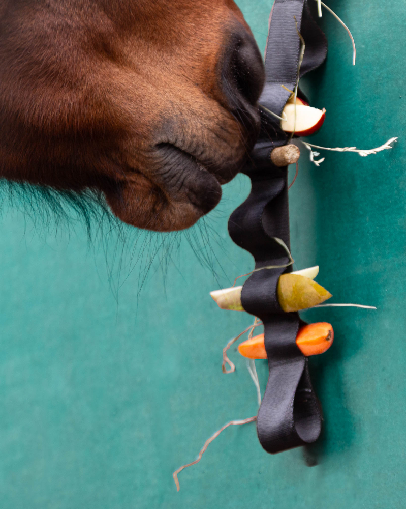 Dette bælte kan holde forskellige typer af grøntsager og rodfrugter, planter eller hø/wrap som hesten kan spise.