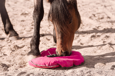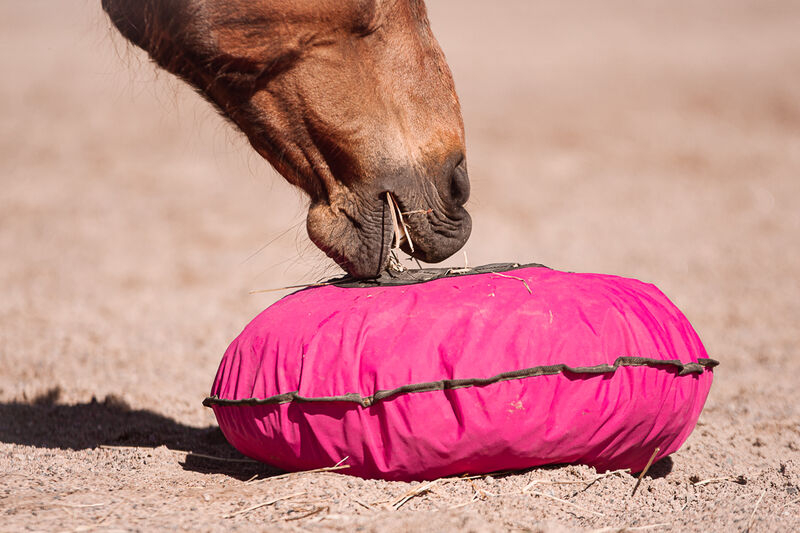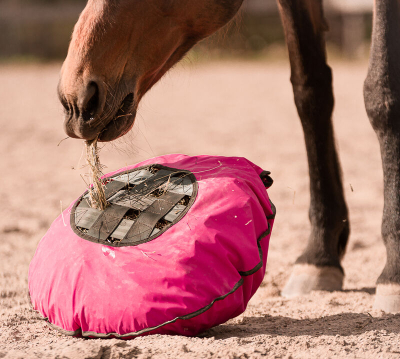Vi anbefaler også at give hø frit sammen med Fluffy Feeder, så hesten kan vælge, hvor den skal spise.