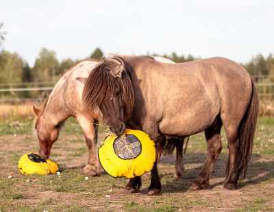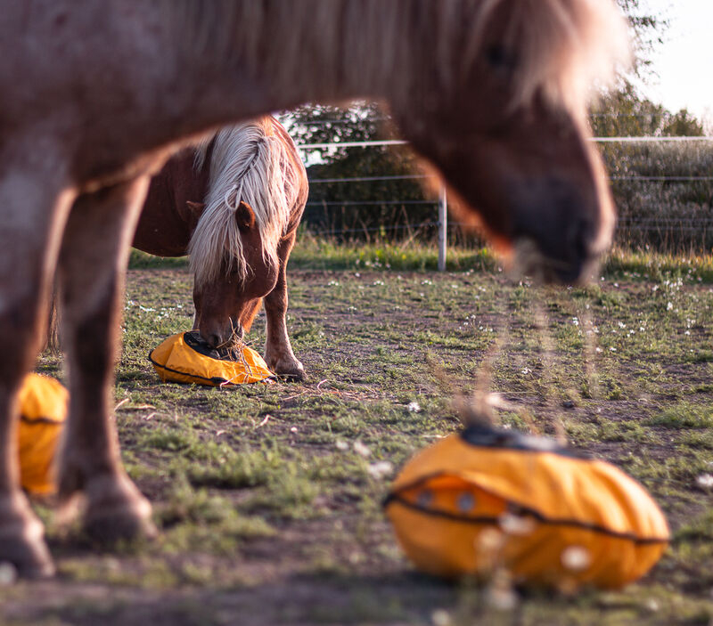 Mini Fluffy kan bruges fx. til ponyer. Det er nemt og hurtigt at fylde, da fyldningsudskæringen er den samme, som den er i den større Fluffy Feeder. Du kan fylde omkring 1 kg i Mini Fluffy. Den kan bruges med tørt hø eller ensilage eller dvs. grønt græs.