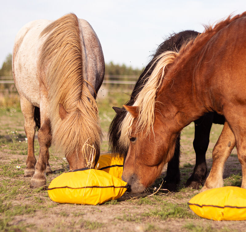 Vi anbefaler også at give hø frit sammen med Mini Fluffy, så hesten kan vælge, hvor den skal spise.